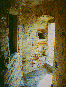 Da sinistra, lavabo, finestra con panche laterali, camino, finestra e, appena visibile, ingresso alla latrina in spessore di muro. |